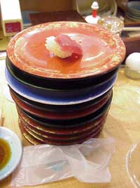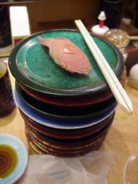 赤皿が一番安いのだが、緑皿のビントロマグロがとてもおいしいので・・・食べる、回転寿司。