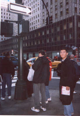 交差点にて。マンハッタンは碁盤の目のように道路が張り巡らされているのはよいのですがその度に信号があるので渋滞のもとになっているようでした。日本にくらべて人の方が車より優先のような感じを受けました・・・信号無視してわたった人を待って車が止まるという場面も多く見うけました。出も車もぎりぎりをすり抜けていく感じで・・・少し怖かったです。交通事故には十分注意しましょう。