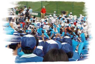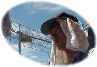 でも、この暑さがいいなぁという面もある。とっても暑い中、目の前の熱いプレーを観る。相乗効果とも言えるかも(^-^) でも熱射病対策の帽子、タオル、そして、スポーツドリンクおよび水分 |