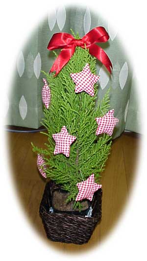 美味しかったですぅ♪すごい、いい感じ。 自作でもこのレベルまではできるんだぁと感動っ!!彼女も喜んでくれました♪いや、結構うまいものですよ・・家庭用のオーブンレンジもなかなかやります。 自作は私のお家芸かと思いつつも・・・実は彼女も、クリスマスツリーを自作してくれていました。 ゴールドクレストに手作りの布で作った星をちりばめ。派手さはないけど、ふたりにとっては十分のツリーです♪ クリスマス3連休の前夜の22日には仕事帰りに お花(ウィンターブーケ)を買って帰り、彼女に はいっと渡しつつ。 ふたりの家での自作クリスマスの演出、いかがでしたでしょうか?みなさまも良きクリスマスを。 (2005.12.24) |