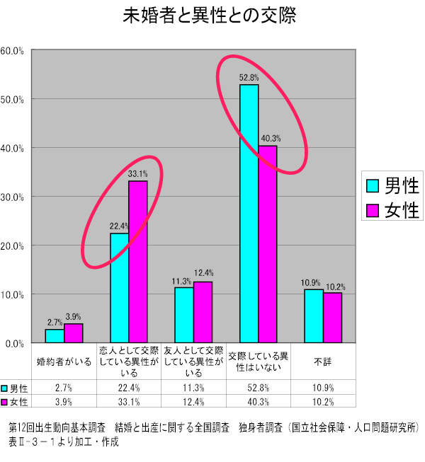 このデータは、18〜34歳未婚者を対象に取ったデータだが・・・「恋人として異性と交際している異性がいる」では男性の方が女性より10%以上低いし、「交際している異性がいない」は男性の方が女性よりやはり10%以上高い。しかも、男性の「交際している異性がいない」率は実に過半数を超えているのである。