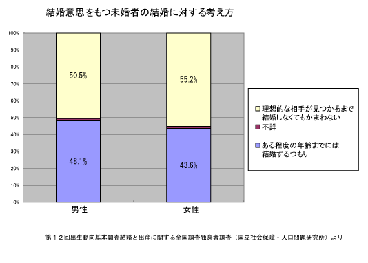 ここで分かるのが、結婚意思のある未婚者の中で、「ある程度の年齢までには結婚したい」という考え方は女性よりも男性の方が5%弱高く、「理想的な相手が見つかるまで結婚しなくてもかまわない」のは男性の方がやはり5%弱低いということ。