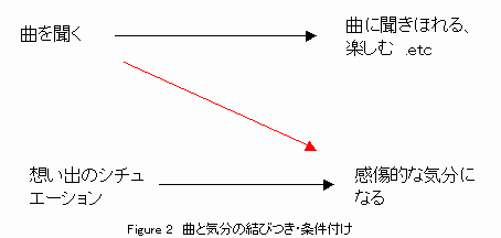 曲を聴くと普通・一般的にはその曲に聞きほれる・楽しむといった反応が出ますよね。でも、その曲を聴くのと同時に、感傷的な気分を起こさせるような想い出のシチュエーションにいたとしたら、前記の(古典的)条件付けが起こり本来的には 刺激−反応関係にない、ある曲を聴くということと感傷的な気分になるというものが結びつくのではないでしょうか?(Figure
